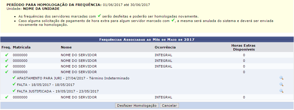 Nesta tela, serão exibidos os servidores com as frequências homologadas e as suas respectivas ausências registradas no sistema.