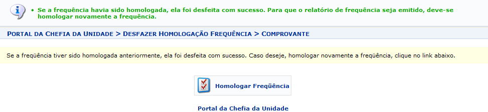 Esta operação tem como finalidade possibilitar que o gestor desfaça a homologação das frequências para os servidores vinculados à sua unidade responsável. Desta forma, as frequências cadastradas não estarão mais homologadas, permitindo assim que o processo de homologação possa ser realizado novamente.